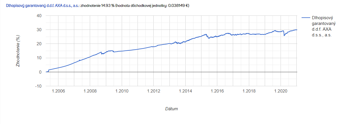 Ponúkajú investorovi bezpečné uloženie úspor, pretože tieto fondy za vklady sporiteľov nakupujú bezpečné cenné papiere, ktoré nepodliehajú významným cenovým výkyvom v nestabilných krízových časoch. Sú to napríklad štátne dlhopisy a peňažné poukážky. Je veľmi málo pravdepodobné, že skrachuje nejaký štát v EU a peniaze samé o sebe sú v podstate bezrizikové. Tieto garantované fondy garantujú vyplatenie vašich vkladov ak hodnota vášho účtu klesne pod hodnotu spolu, ktorú ste na váš osobný účet vložili. Nižšie na grafe je výkonnosť UNIQA garantovaného dlhopisového fondu s priemerným ročným výnosom 1,66% p.a., ktorého výnosová krivka je rastúca bez významnej volatility počas finančnej krízy v roku 2008 a prvého kola pandémie v roku 2020.