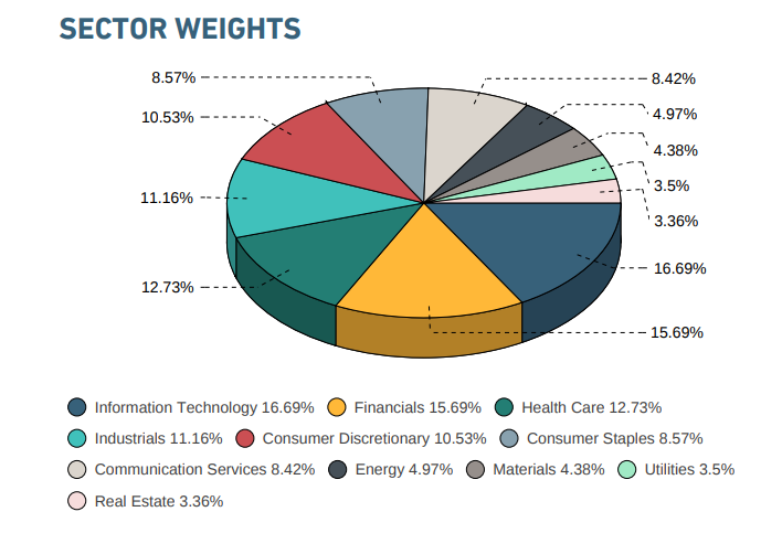 Tieto fondy investujú finančné prostriedky fondu do akcií spoločností a v zásade sa snažia kopírovať, alebo prekonať výkonnosťou benchmark. Benchmark je východiskový ukazovateľ, podľa ktorého správcovia porovnávajú výkonnosť ich fondov. Pre 3 najvýkonnejšie Indexové fondy správcov NN, VUB Generali a UNIQA je benchmarkom MSCI World Index. Portfólio Indexu je zložené z 1650 firiem z 23 krajín sveta. Nižšie uvádzam graf s rozložením portfólia po priemyselných sektoroch.
