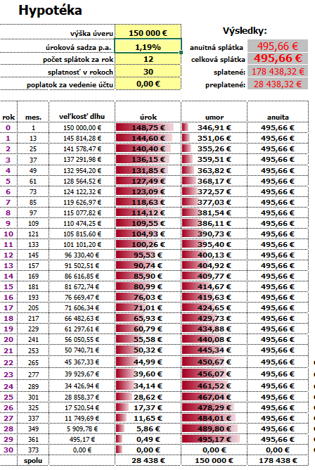 Jedným zo spôsobov je refinancovanie úveru v inej banke s výhodnejšími podmienkami. Poďme sa spolu pozrieť aké má dnes možnosti klient s úverom na bývanie 150.000 € na 30 rokov s úrokom 1,19% p.a. a mesačnou splátkou 495,66 € (obrázok nižšie).