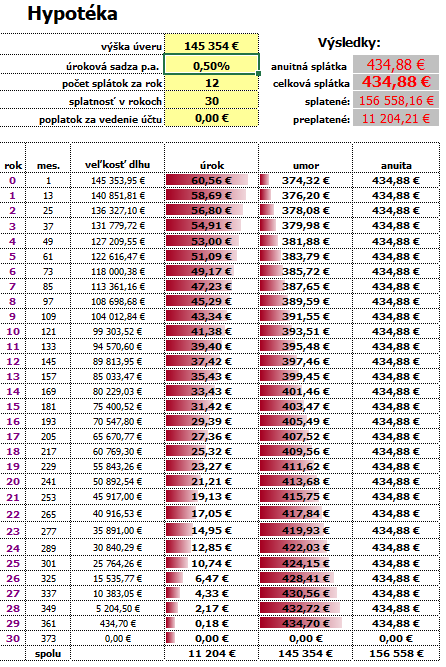 Po základnom prepočítaní úveru so zníženou úrokovou sadzbou a znížením splátky o 60,78 € poďme viac do hĺbky a pozrime sa na ďalšie dôležité finančné výhody, ktoré refinancovanie hypotéky prinieslo. Mesačná splátka pozostáva zo splácania úroku a zo splácania požičanej sumy (istina). V stĺpci úrok v prvom roku vidí klient po refinancovaní úrokovou sadzbou 0,5% p.a sumu 60,56 €. To je úrok, ktorý platí v jeho mesačnej splátke. V stĺpci Umor je 374,32 € a to je istina, ktorou spláca požičanú sumu a znižuje tak výšku úveru, ktorá mu ešte zostáva na vrátenie. Pred refinancovaním s pôvodnou úrokovou sadzbou 1,19% p.a. bol úrok 148,75 €. Keď si klient odpočíta od tohto úroku nový úrok 60,56 € zistí, že každý mesiac spláca menej úrokov o 88,19 € a zároveň o týchto 88,19 € spláca viac zo svojho požičaného úveru!