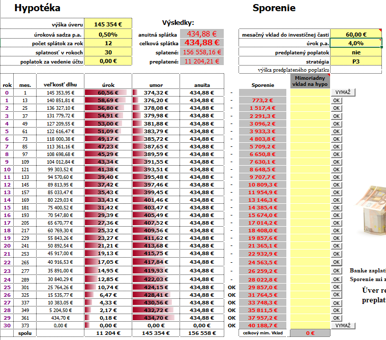 Ak vám tieto peniaze bytostne nechýbajú, máte môžnosť ich zhodnotiť investovaním napríklad do realít, dlhopisov, či akcií. V úverovej kalkulačke nižšie v časti Sporenie je znázornený vývoj vášho sporenia za 30 rokov s 4% zhodnotením. Máme skúsenosti aj s výnosnejšími investičnými nástrojmi, ktoré ponúkajú priemerné ročné zhodnotenie aj 10% p.a., ale ostaňme konzervatívny. Už na 24 rok sporenia je hodnota vašej investície 28.022 € a môžete splatiť váš úver jednorazovou mimoriadnou splátkou a tým skrátiť splácanie dlhu o 6 rokov. Finančne naše refinancovanie prinesie celkovo úsporu 17.144,11 € na mesačných splátkach znížením úrokovej sadzby a investovaných 60 € mesačne prinesie čisté zhodnotenie ďalších 10.742 €, pretože 28.022 € pozostáva z vášho mesačného sporenia o výške 17.280 a 10.742 € je výnos za 24 rokov pri priemernom zhodnotení 4% p.a. Celkovo je vaša čistá úspora na úvere aj s investovaním 27.886 €.