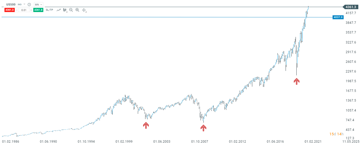 Na grafe nižšie je znázornený vývoj ceny akcií 500 najväčších amerických firiem v indexe S&P 500 obchodovaný na burze NYSE v New Yorku. Na grafe som šípkami poukázal na 3 veľké trhové krízy s označením ich dna. Z ľava technologická DOT.com bublina z 2000, Hypotekárna kríza 2008 a Pandémia 2020. Následný vývoj cien akciového S&P 500 je jasný. Agresívny rast a prekonanie maxím z predkrízového obdobia.